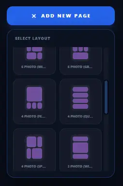 - Add Page: Select from various grid types (3x3, 4x4, mix of text and images).