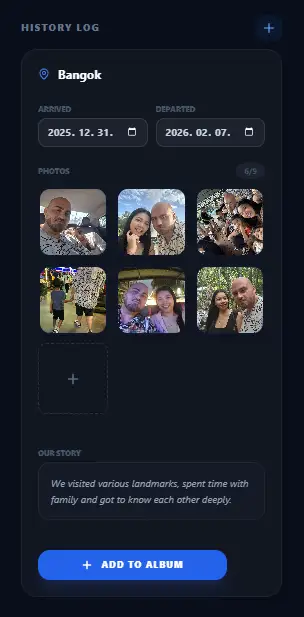 Organize your photos chronologically by creating Trip Logs. Each log can hold a location, dates, and a detailed "story" of that specific meeting.